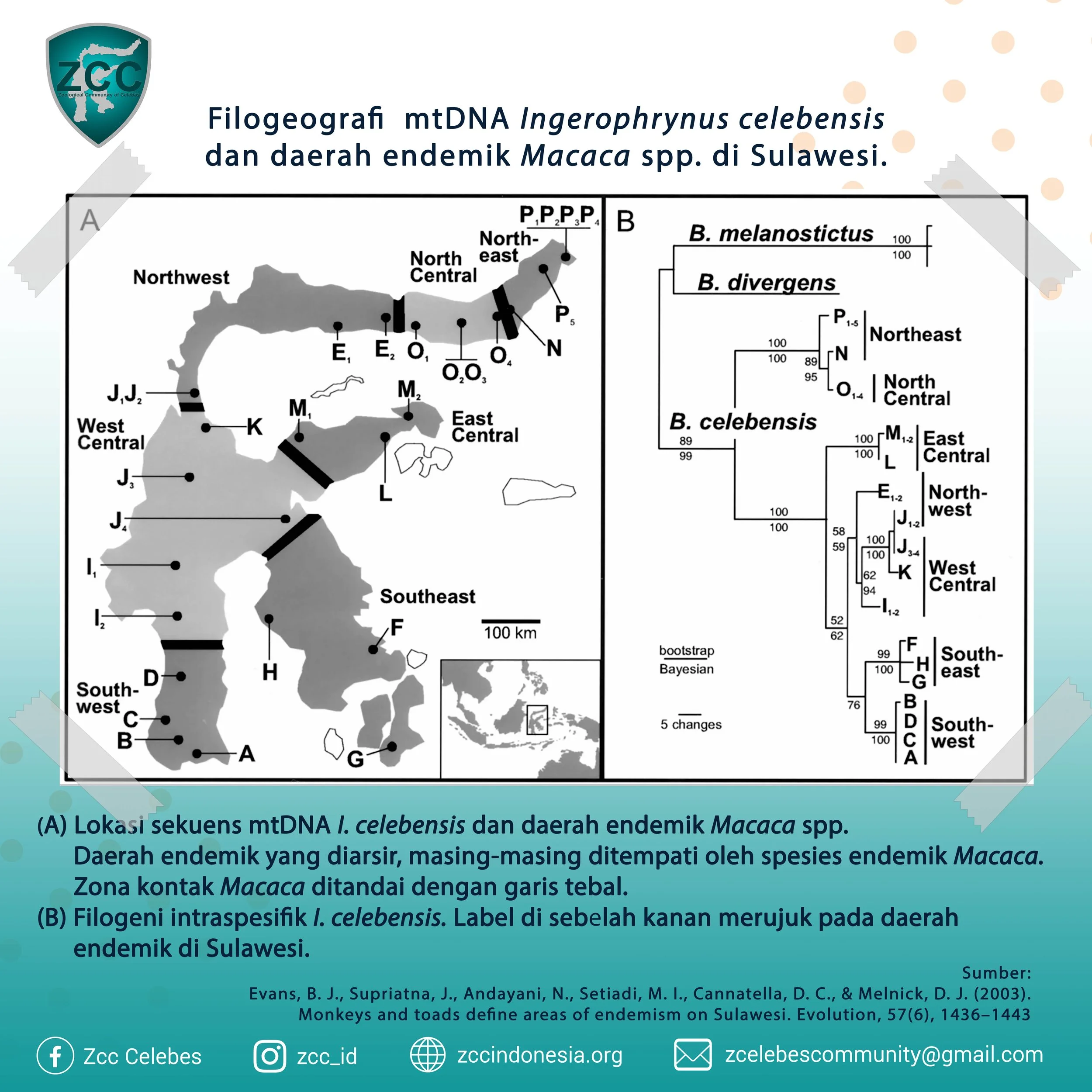 Evans et al. (2003) dalam laporannya menggambarkan tujuh daerah endemik (areas of endemism) yang sangat sesuai yang dimiliki oleh Monyet (Macaca spp.) dan Kodok Sulawesi, dengan menghasilkan filogeni intraspesifik dari Ingerophrynus celebensis dan membandingkannya dengan zona kontak spesies dan populasi monyet Sulawesi. Dua pengecualian untuk distribusi geografis yang sesuai dari endemisme monyet dan mtDNA kodok terdapat di Northeast di mana sekuen kodok N (Northeast) mengelompok dengan O (North Central) daripada P (Northeast), dan di Northwest di mana urutan katak J melintasi zona kontak dari West Central ke dasar daerah Northwest (Slide 2). Selain itu, pemisahan awal pada sekuen mtDNA Kodok Sulawesi menunjukkan bahwa nenek moyang takson ini mungkin pertama kali tiba di semenanjung utara Sulawesi. Analisis mtDNA kodok, morfologi monyet, autosomal monyet dan DNA kromosom Y menunjukkan pola biogeografis yang hampir sama, sehingga area endemik pun hampir sama persis (pada monyet dan kodok). Dengan demikian, hasil ini memfasilitasi pemahaman tentang biogeografi dan genetika konservasi fauna Sulawesi.